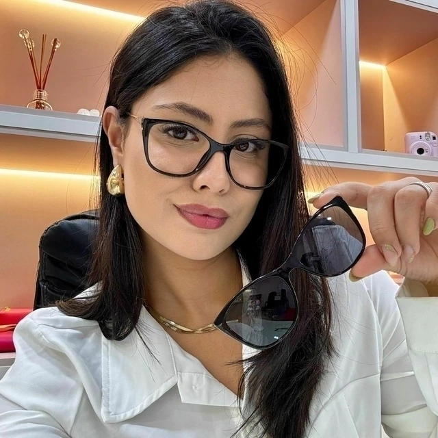 O modelo vem com lentes de sol no estilo clip-on, garantindo que você esteja pronta e protegida nos dias ensolarados, com todo o charme das armações retangular.