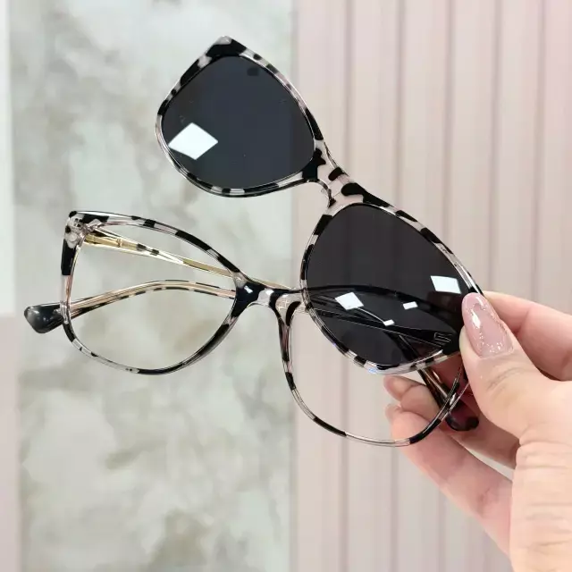O modelo vem com lentes de sol no estilo clip-on, garantindo que você esteja pronta e protegida nos dias ensolarados, com todo o charme das armações retangular.